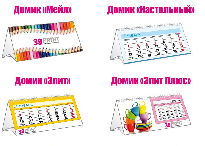 Стойка: формат 220x120 мм, картон 300 г/м2, печать 4+0, календарный блок: бумага 140 г/м2,12 листов + обложка, печать 4+4, рекламное поле 220x20 мм отделка: скрепление пружиной wire-O. - Домик «ЭЛИТ плюс»